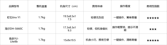 三款制氧机整机重量相同,但便携体感和操作易用性差异明显,町石tinx Y1和鱼跃YU-Lite8b表现较好,海尔DH-S660C操作略繁琐,携带体感一般。