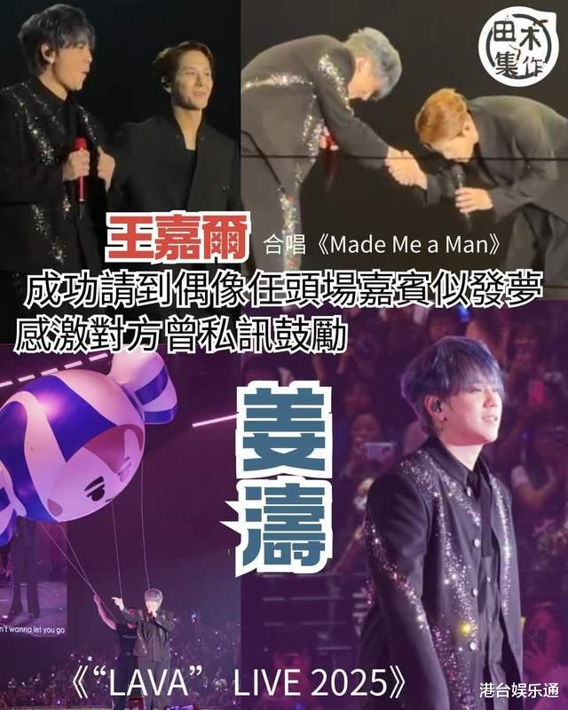 随后,姜涛称这次合作感觉像做梦一样,更透露自己几年前曾在Instagram上收到王嘉尔的私信,内容为鼓励性质,至今难忘。王嘉尔听到后立即回敬,感谢姜涛的邀请,并赞“姜糖”(姜涛粉丝昵称)对偶像的支持非常卖力。