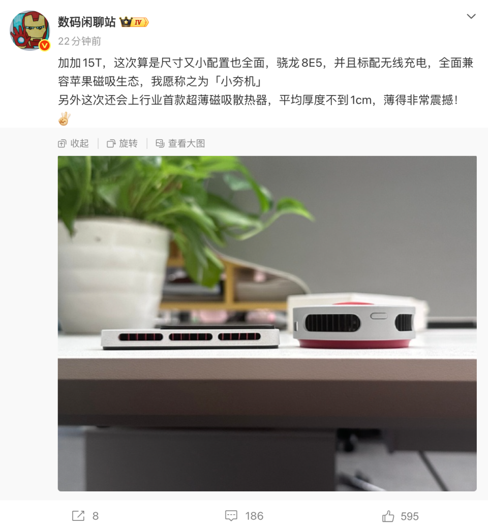 日前,数码博主“数码闲聊站”曝光了一款慈溪散热器的对比谍照,并配文称,“加加15T,这次算是尺寸又小配置也全面,骁龙8E5,并且标配无线充电,全面兼容苹果磁吸生态,我愿称之为「小夯机」 另外这次还会上行业首款超薄磁吸散热器,平均厚度不到1cm,薄得非常震撼!”从谍照上看,这款散热器的厚度比目前的磁吸散热器确实要薄的多,并且外观貌似也改成了长方形。