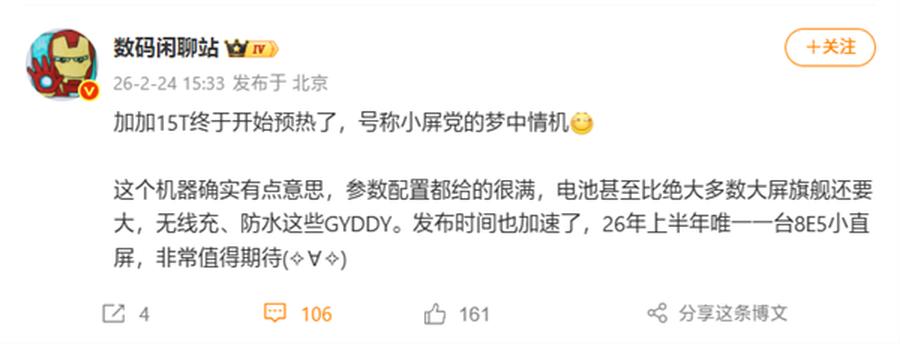 另外,近日,“数码闲聊站”也爆料称,“加加15T终于开始预热了,号称小屏党的梦中情机 这个机器确实有点意思,参数配置都给的很满,电池甚至比绝大多数大屏旗舰还要大,无线充、防水这些GYDDY。发布时间也加速了,26年上半年唯一一台8E5小直屏,非常值得期待(✧∀✧)”。