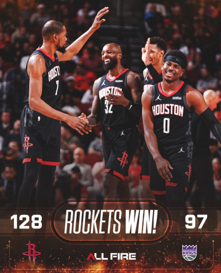 易边再战,国王上来掀起反扑将分差追到20分以内,杜兰特站出来连续拿分为火箭稳住局面,紧接着申京和谢泼德一起发力又将分差拉大到30分以上。最后一节彻底进入垃圾时间,杜兰特最后一节甚至没有登场,最终火箭128-97大胜国王取得2连胜。