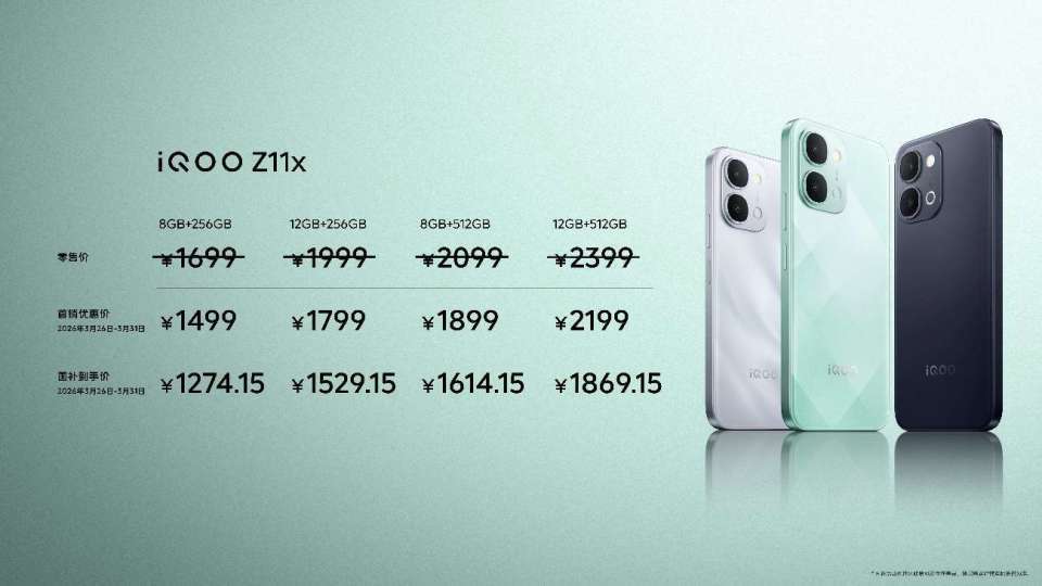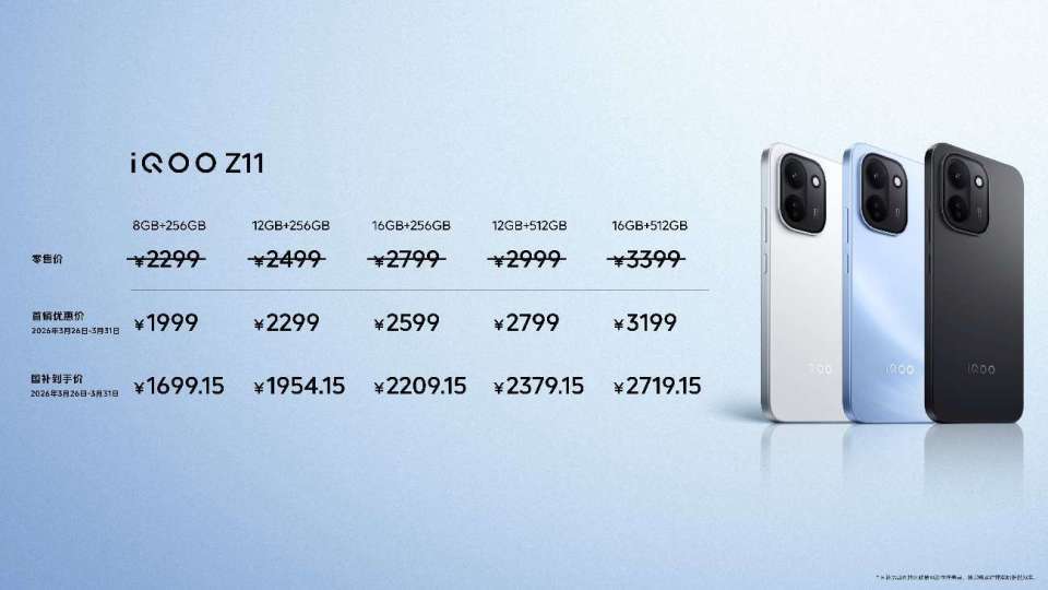 2026 年 3 月 26 日,“性能续航小超人”iQOO Z11 系列正式发布并已全渠道开售,首销补贴到手价 1499