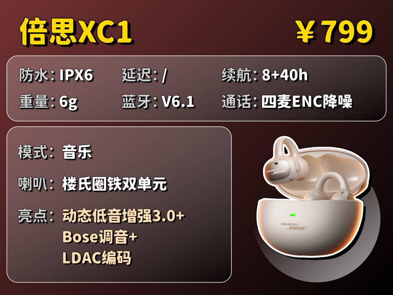 倍思 XC1在音质上采用楼氏圈铁双单元,结合了动圈的饱满氛围与动铁的清晰解析力,声音细节丰富;SuperBass 3.0动态低音增强技术能智能强化低频,让鼓点更深沉有力;同时支持LDAC高清编码,能保留更多音乐细节,整体听感均衡且层次分明。在佩戴上采用云朵气囊与镍钛合金丝,触感柔软并能分散压力,长时间佩戴舒适,但稳固性一般,运动时需留意。在性能上具备四麦通话降噪,通话清晰度高;支持IPX6级优秀防水;并拥有长达40小时的总续航,能满足多日使用需求。