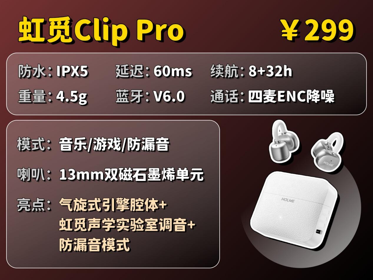 虹觅Clip Pro是300价位我用过的耳夹中音质表现最好的一档。它在音质上搭载了13mm双磁石墨烯单元,由两块高精度磁铁相互叠加强化磁场,让声音听起来更响;而且它振膜的石墨烯材质有很好的韧性,能让声音细节更完整;还配备了气旋式引擎腔体,用铝合金的材质,将发声端设计为圆柱形,这种金属腔体能够推动更多气流,让鼓点这类低音的表现更澎湃,整体音质非常突出。而且它在其他方面的表现也很不错,佩戴上它采用2.5mm错位设计和∠12弧面耳托,能紧贴耳背,分散压力,加上仅4.5g的单耳重量,长时间佩戴也不会累。而且它还配备了防漏音模式,开启后会生成与漏音方向相反的声波来抵消漏音,在安静场所使用也不怕漏音;同时搭配了蓝牙6.0和智能一拖二功能,加上四麦ENC降噪还是指向性设计,只接收嘴巴那个方向的声音,能有效隔绝其它的环境噪音,让通话更清晰,整体配置拉满,非常适合预算有限但想追求高使用体验的朋友。