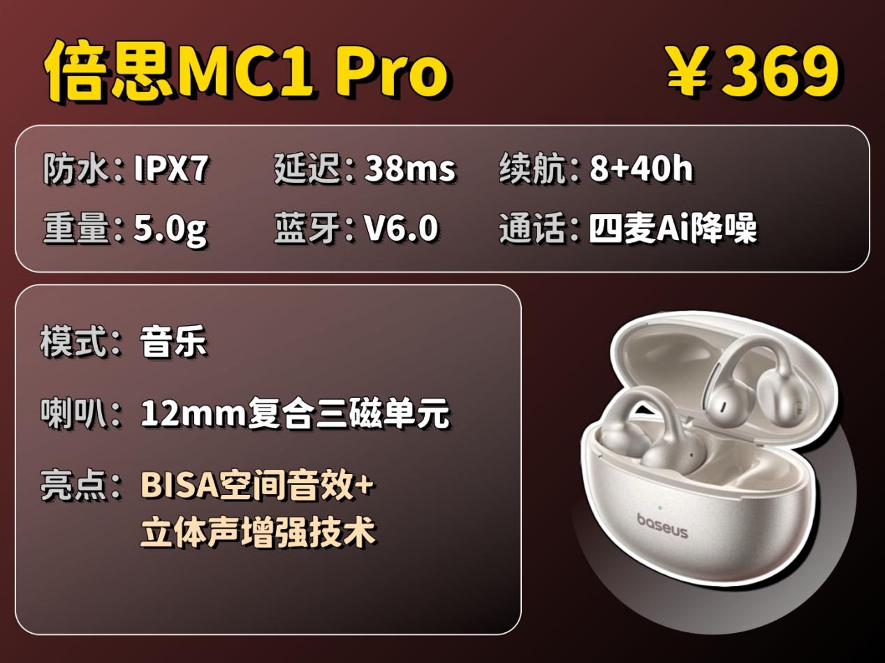 倍思MC1 Pro在音质上配备12mm复合三磁单元,能让声音更响,加上BISA空间音效和立体声增强技术,人声细节和空间感都能有很好的展现,整体听感表现突出。佩戴上采用呼吸泄压设计和云朵缓压气囊Pro的设计,能分散耳部压力,5克的机身也比较轻,长时间使用舒适感不错。性能上具备IPX7高级别防水,无惧汗水和雨水,续航非常持久,并支持一拖二连接和四麦通话降噪。虽然它有一定的漏音情况,但它佩戴舒适、防水出色且续航很强。适合看重耐用性和续航的用户。