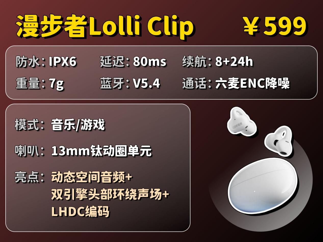 漫步者Lolli Clip在音质上搭载13mm动圈单元,为声音提供了扎实饱满的基底;动态空间音频技术能营造出开阔且有层次的声场,显著增强了听歌观影的沉浸感与环绕效果;同时支持LHDC高清编码,确保了更多音乐细节的传输。在佩戴上采用C形桥与多曲度软梁结构,与耳廓贴合稳固,但单耳7克的重量在同类产品中偏重,长时间佩戴会感到累。性能上具备六麦ENC通话降噪,通话清晰度高;支持IPX6级优秀防水,无惧汗水雨水;并拥有一拖二连接与持久的综合续航能力。