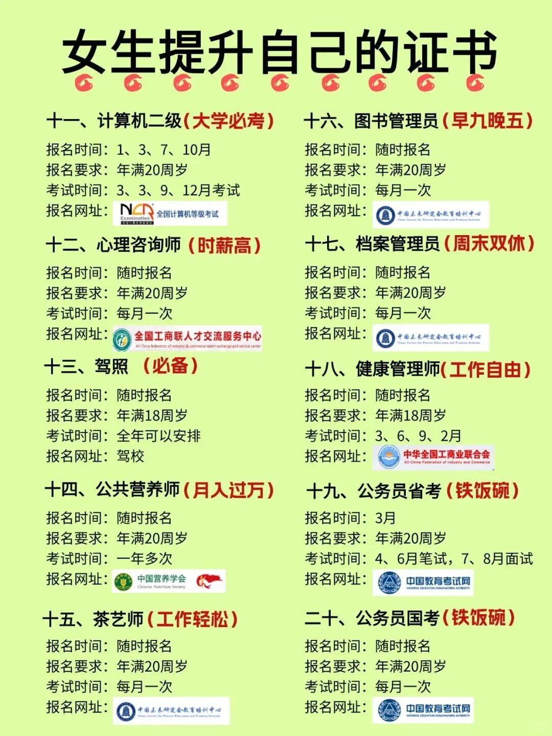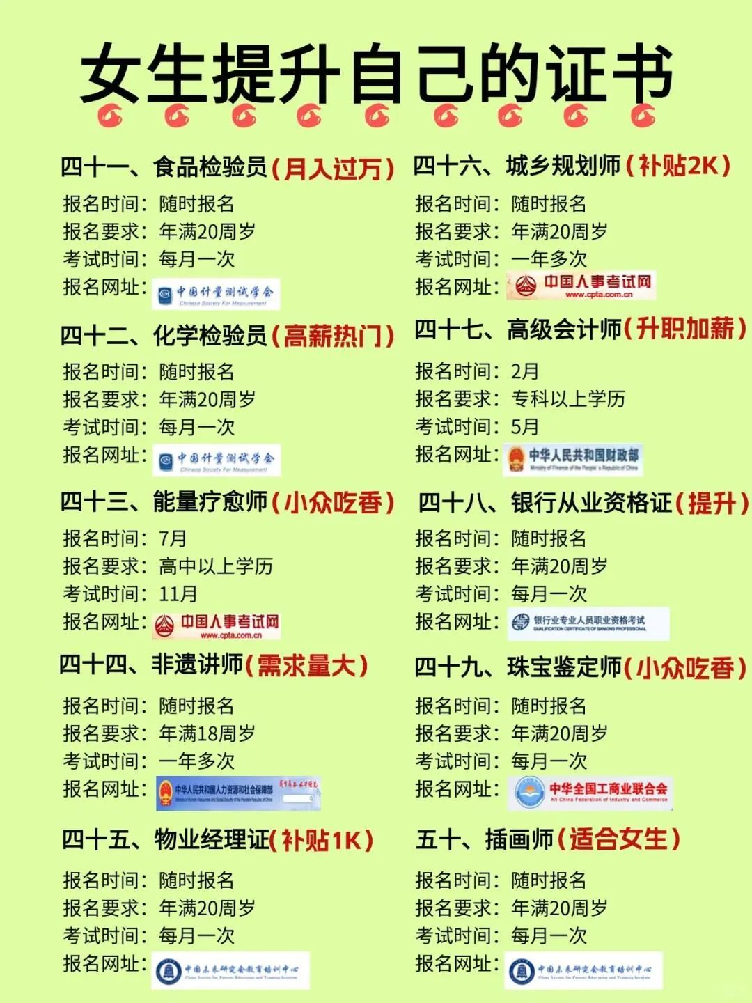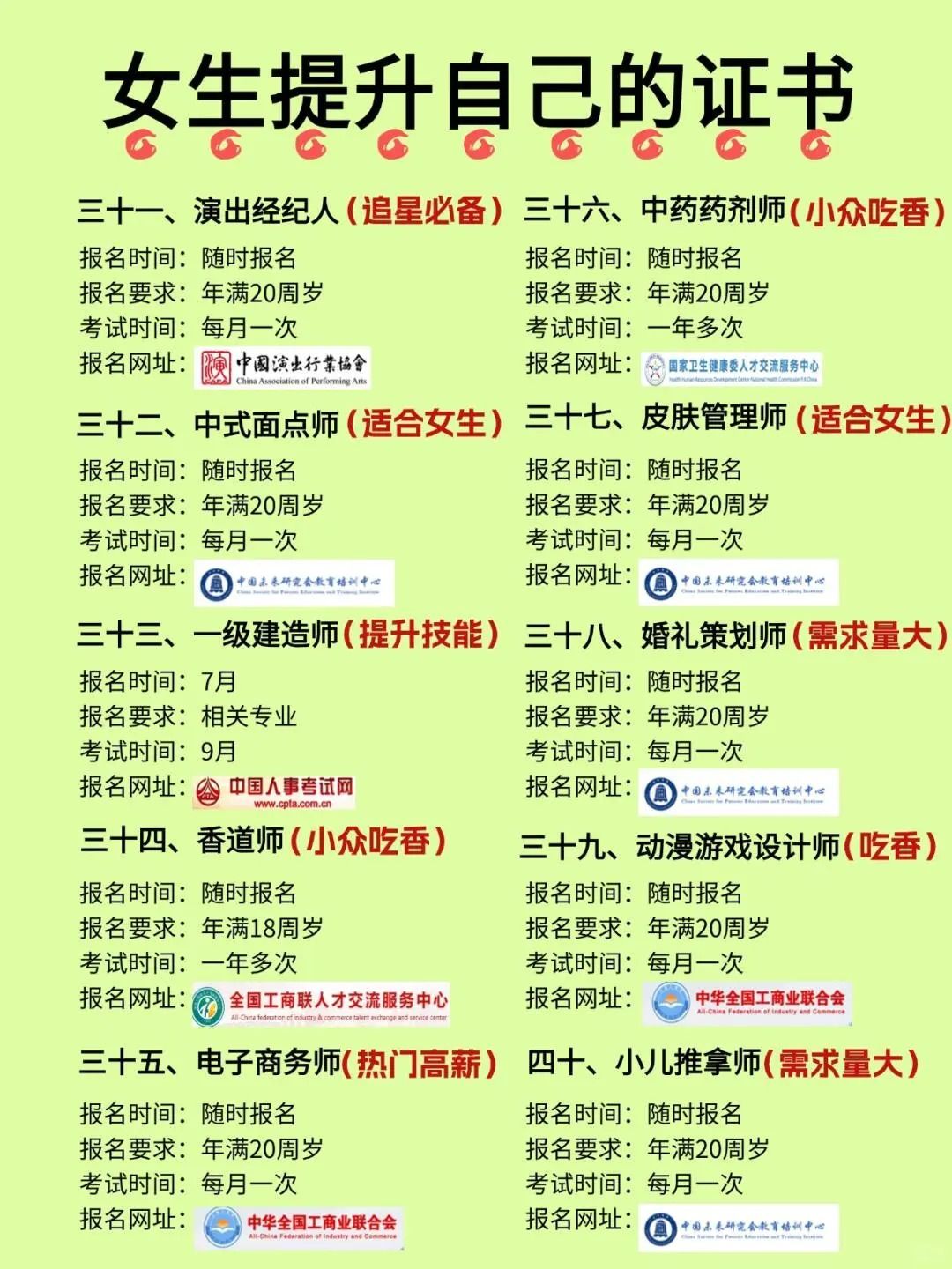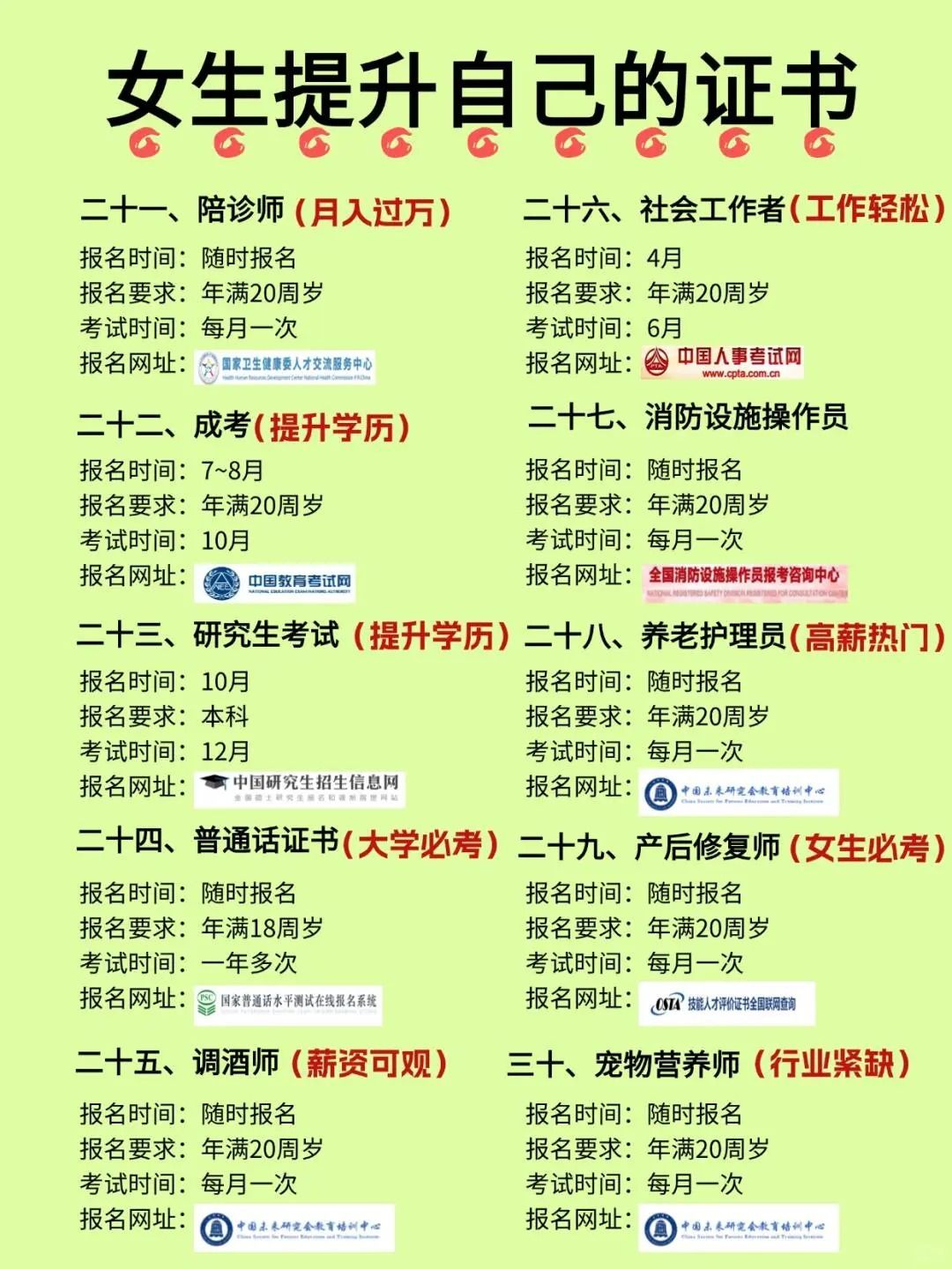 随时报名|每月考试|自媒体/短视频运营 国家广电总局发证,副业主业两不误 ✅ 公共营养师 随时报名|一年多次考试 食品企业/健身房/月子中心刚需 月薪8000-20000+,早九晚五双休 ✅ 育婴师 随时报名|3/6/9/12月考试 经验越老越值钱,可接私单上户 薪资7000-18000+,适合宝妈转行 💼【稳定体面·铁饭碗】 ▪️教师资格证 1/7月报名|3/9月考试 寒暑假+周末双休,考编必备 ▪️ 公务员省考/国考 3月报名|4-8月考试 铁饭碗工作,福利待遇拉满 ▪️ 人力资源管理师 随时报名|多个月份考试 各行业刚需,朝九晚五不加班 🎨【小众吃香·女生友好】 ▫️茶艺师 随时报名|每月考试 修身养性,工作环境优雅 ▫️ 整理收纳师 随时报名|每月考试 时薪计费,一二线城市吃香 ▫️ 图书管理员 随时报名|每月考试 社恐福音,早九晚五工作自由 ▫️ 演出经纪人 随时报名|每月考试 追星女孩必备,近距离接触偶像 ——————————————