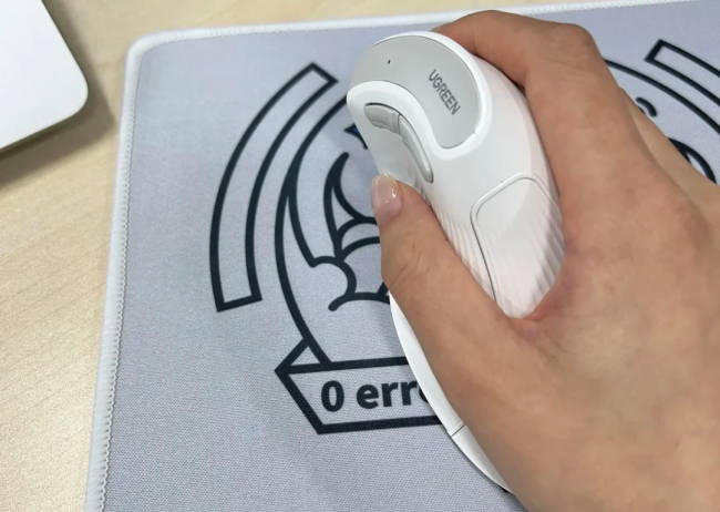 绿联 MU008mini 作为一款人体工学鼠标,其设计旨在提供长期使用时的舒适感。采用57°垂直倾角,手腕保持接近自然状态,能有效减少手腕和前臂的负担,适合长时间办公使用。尺寸方面,它的112×92×80mm大体积提供了更加稳定的握持感,手掌与鼠标的接触面广,避免了长期使用中的不适感。为了提升抓握的稳定性,鼠标的侧面进行了防滑处理,特别是在拇指区域增加了支撑,减少了打滑的可能。但由于它的体积较大,对于手小的用户来说,可能会感到握持不适,且垂直结构需要一定的适应期。