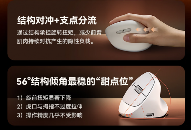 不少立式鼠标仅做简单垂直造型,倾角不适(过高或过低)、无拇指承托,久坐办公易虎口胀痛,反而加重腕部负担。