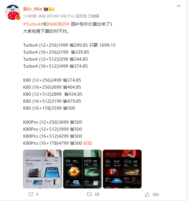 红米K80 Pro最低到手价只要3199元起,最高省500元。