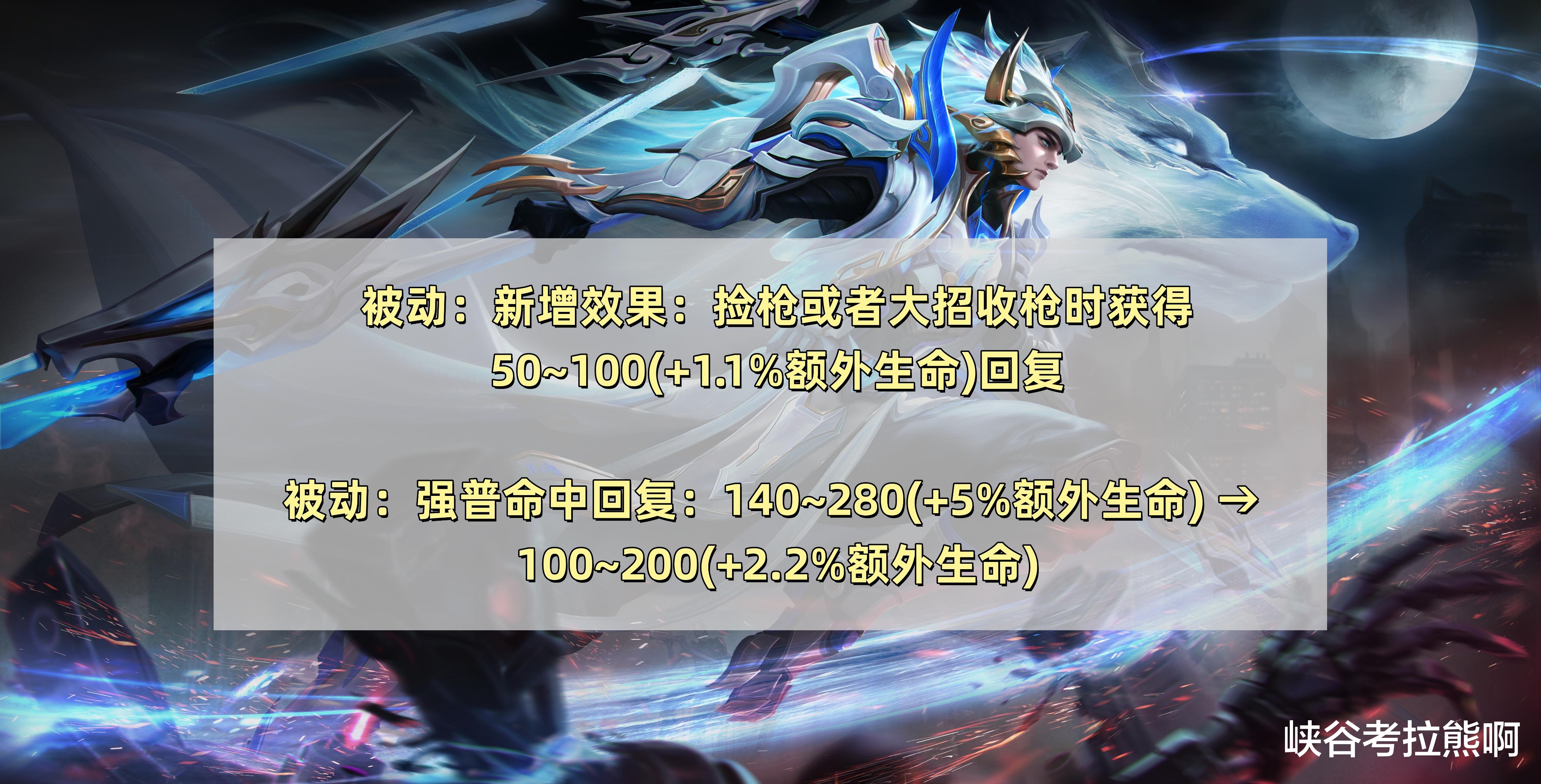 被动:新增捡枪或者大招收枪时获得50~100点基础回血,以及1.1%额外生命值加成。但强普命中的回血效果降低40~80点,额外生命加成降低2.8%。