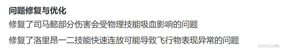 除了以上三位的英雄调整之外,本次还修复了司马懿部分伤害会受到物理技能吸血的影响,以及修复了洛里昂一二技能快速连放会导致飞行物异常的表现。