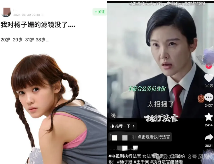 除了过度医美带来的后遗症,剧中女主的人物形象本就不讨喜,不管是对领导、同事,还是对被执行人员,由她饰演的楚庭长总是一副凶神恶煞、愤怒气愤的表情,即使有个别几个微笑和调皮的表情,也让观众倍感感觉尴尬,由此,引发网友对杨子姗演技的质疑。