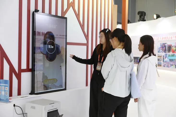 此外,陕演集团旗下陕西数字演艺科技有限公司落地多项数字交互技术。榆林旅游推荐官数字人基于自研AI文旅大模型开发,形象融合窑洞、图书等元素,可实时智能对话介绍文旅资源;会展中心智慧大屏采用数据聚合与可视化技术,实时呈现图书馆业务数据与参观人流,支持多终端查询与智慧导览;AI换装互动系统设计陕北民俗与历史主题虚拟服饰,用户可生成定制照片,增强参会趣味性;VR景区漫游体验通过无人机航拍与三维重建技术,还原镇北台等景区,支持沉浸式游览。四大板块推动会展服务智慧升级,展现文化与科技融合创新。