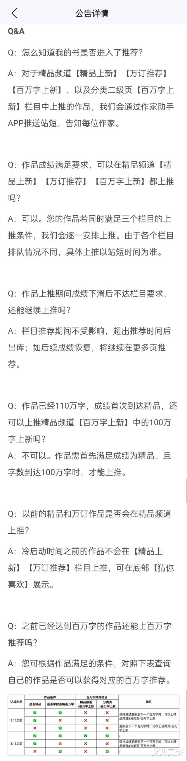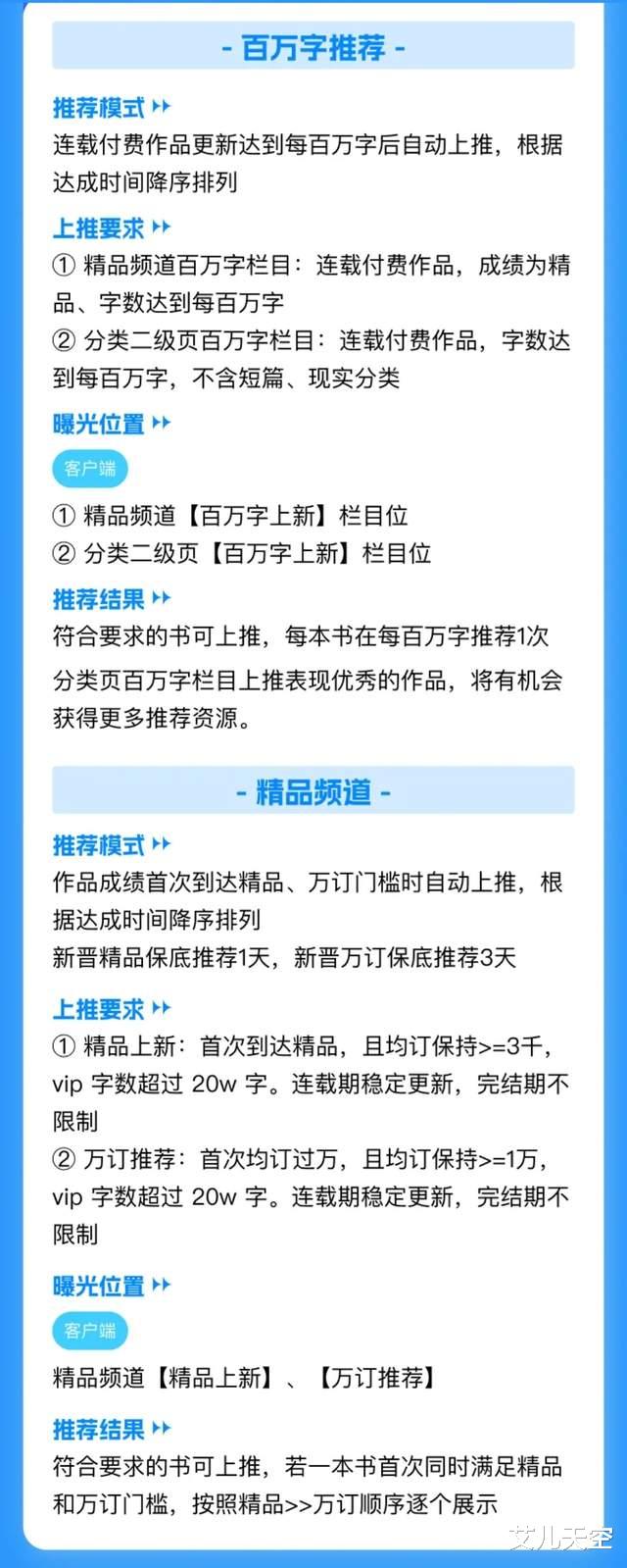 起点作家助手今天发了公告,之前计划推出的推荐模式:百万字推荐、精品频道已经安排上了。