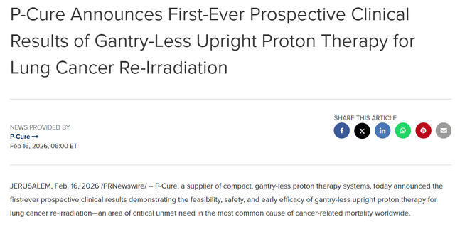 2月16日,P-Cure公司宣布了首批前瞻性临床结果,该结果证明了采用无旋转机架直立位质子疗法对肺癌进行再照射的可行性、安全性和初步疗效。