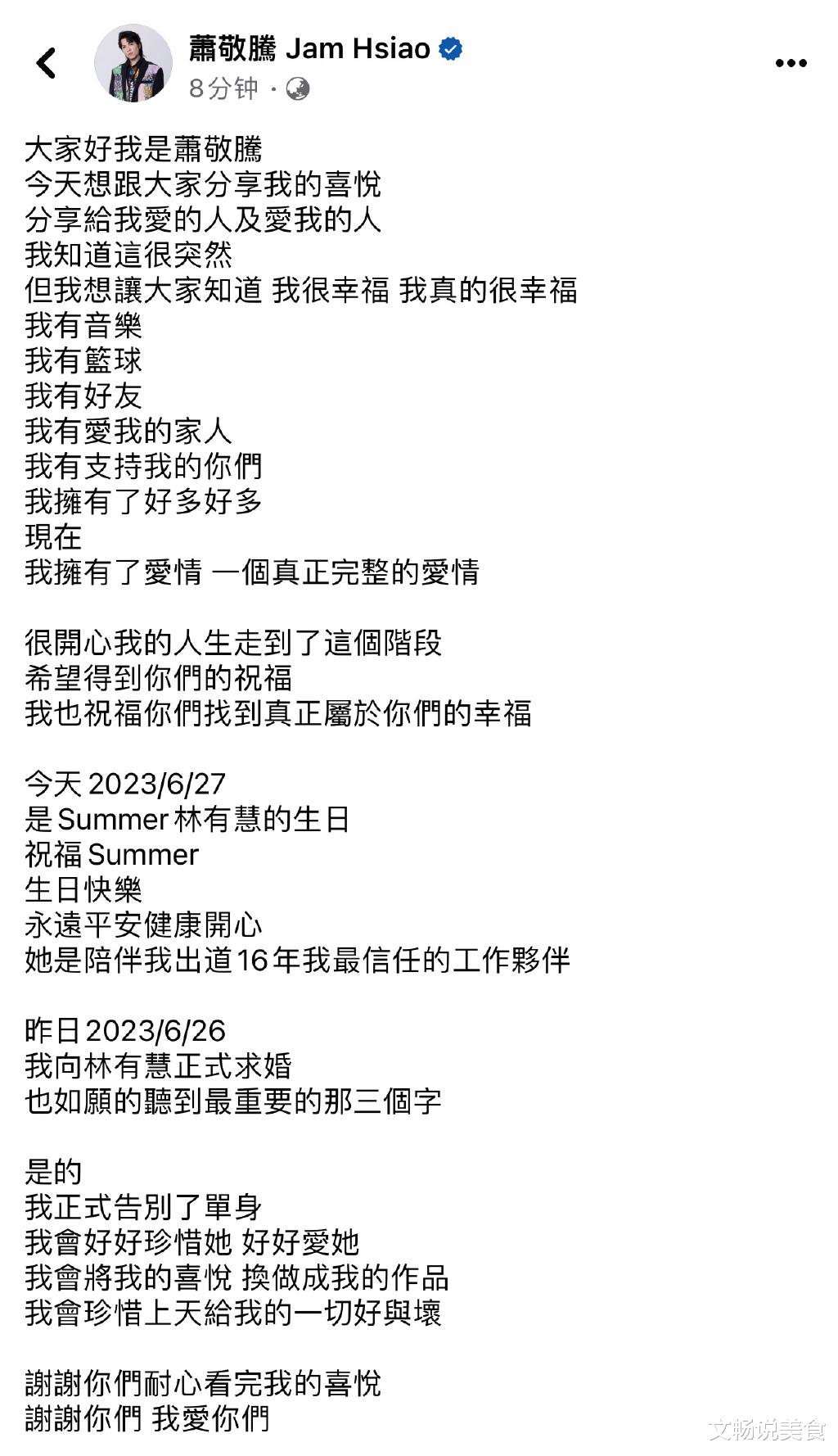 6月27日20:15,台湾娱乐圈曝出大瓜,不过,大家别紧张,乌烟瘴气的台湾娱乐圈不是传来让人三观碎满地的猛料,而是被萧敬腾冲出了重围。这一次,萧敬腾不是因为敢高调验毛发自证清白而口碑飙升,而是因为他的终身大事终于有结果了!萧敬腾高调发文表示,此刻的他,很幸福,真的很幸福!因为拥有了一个完整的爱情。今天是Summer林有慧的生日,她是陪伴自己出道16年,自己最信任的工作伙伴。就在林有慧生日的前一天,萧敬腾做了一件大事,跟林有慧正式求婚。林有慧也没有让他失望,让他听到了期待中的三个字!如今的萧敬腾已经求婚成功,正式告别单身了!萧敬腾还晒出他和未婚妻林有慧的恩爱合照,照片中,他环抱着未婚妻,一脸温柔。两人四目相对。林有慧更是娇羞中满满都是喜悦。足见两人真的很恩爱。据悉,林有慧今年50岁,萧敬腾今年36岁,两人相差14岁。不过,看照片倒是看不出这样巨大的年龄差。不少网友看后,纷纷表示:恭喜老萧,能在你伴郎团里看到白敬亭王嘉尔井柏然吗(这些不知道,但是,估计肯定能看到向佐[捂脸])蔡徐坤、陈建州、蓝正龙,传来贺电:大恩不言谢[捂脸]恭喜!顺便问一句,啥时候来趟北京,热得不行了[捂脸]终于听到台湾娱乐圈的好消息啦求婚成功了,记得遵守男德,不要学一些已婚男人婚后的作风问题,不然会出现在男德牌坊上[捂脸]贵圈男明星的一大归宿:与经纪人长相厮守[捂脸]还有网友一边恭喜,一边火速询问:还有明星缺助理吗?现在应聘还来得及吗[捂脸]