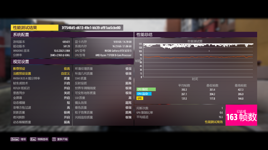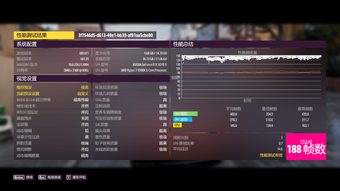 《极限竞速·地平线5》测试,4K分辨率下,极端画质,极端光追,开启DLSS 3.0并设为超级性能模式,游戏平均帧数188 FPS,DLSS为质量模式时,游戏平均帧数163 FPS;