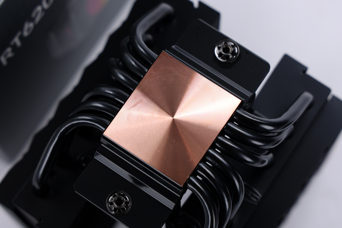 散热底部是一块大面积精雕纯铜底座,并通过回流焊的工艺与散热塔体和6根热管相连接,使处理器的热量可以快速传导至散热塔体中,而精雕底座和底座上方的锰钢材质高韧性压力扣具,可以让散热器和CPU顶盖紧密的贴合,从而提高散热器的散热效率。