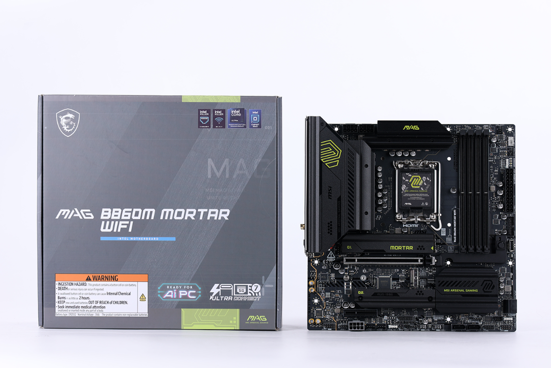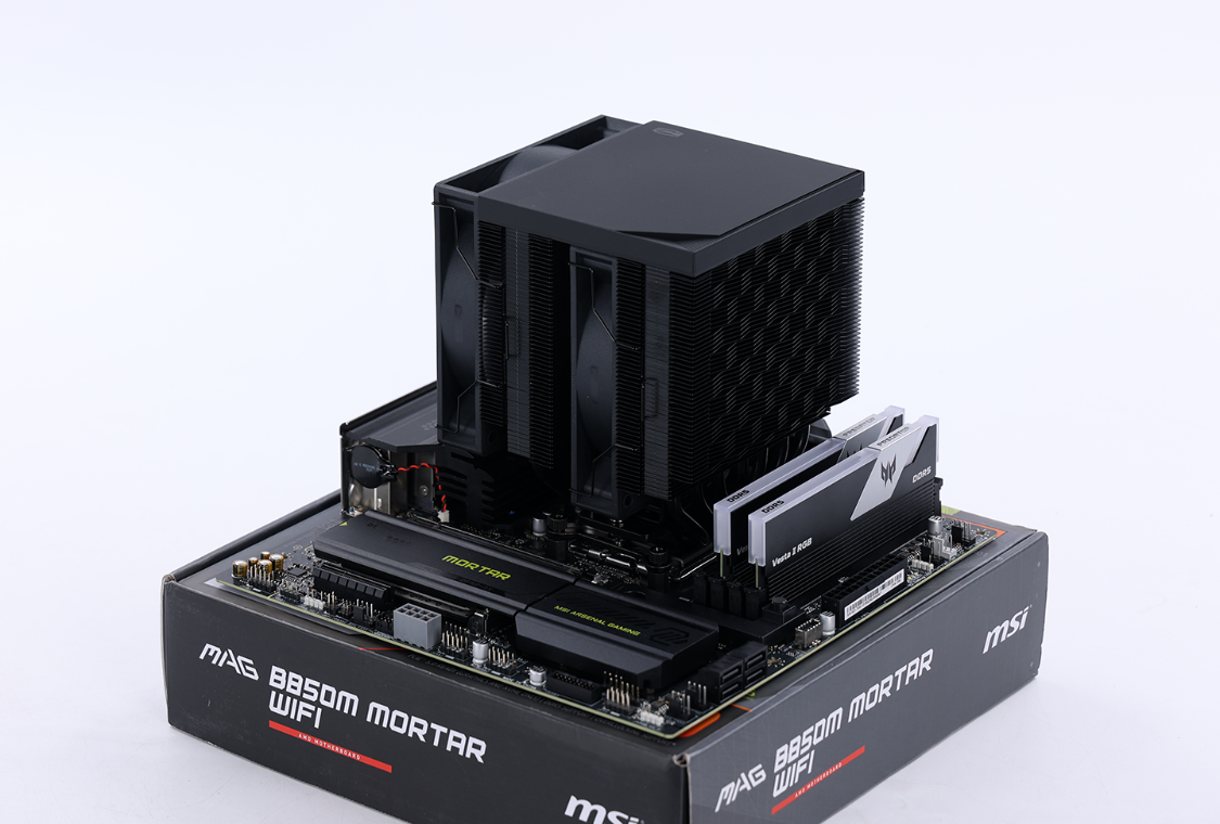 微星MAG B850M MORTAR WIFI主板:主板整体是这种暗黑金属风格,大面积的金属散热马甲,此外还有一些黄绿配色元素点缀,低调但辨识度高。配置方面,主板采用8层服务器级PCB,12+2+1相供电,可以轻松拉满锐龙9000系列处理器性能。3个M.2接口(正面两个PCIe5.0*4+背面一个PCIe4.0*2)设计,内存支持DDR5 8200MT/s。