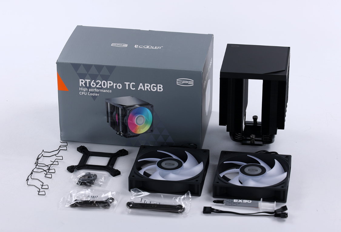 超频三RT620 Pro TC ARGB黑色风冷,直接先上个配件全家福。除了AMD和Intel双平台扣具外,还提供两组散热风扇卡扣、一根二合一PWM 4Pin供电线以及一管超频三EX90高性能导热硅脂。