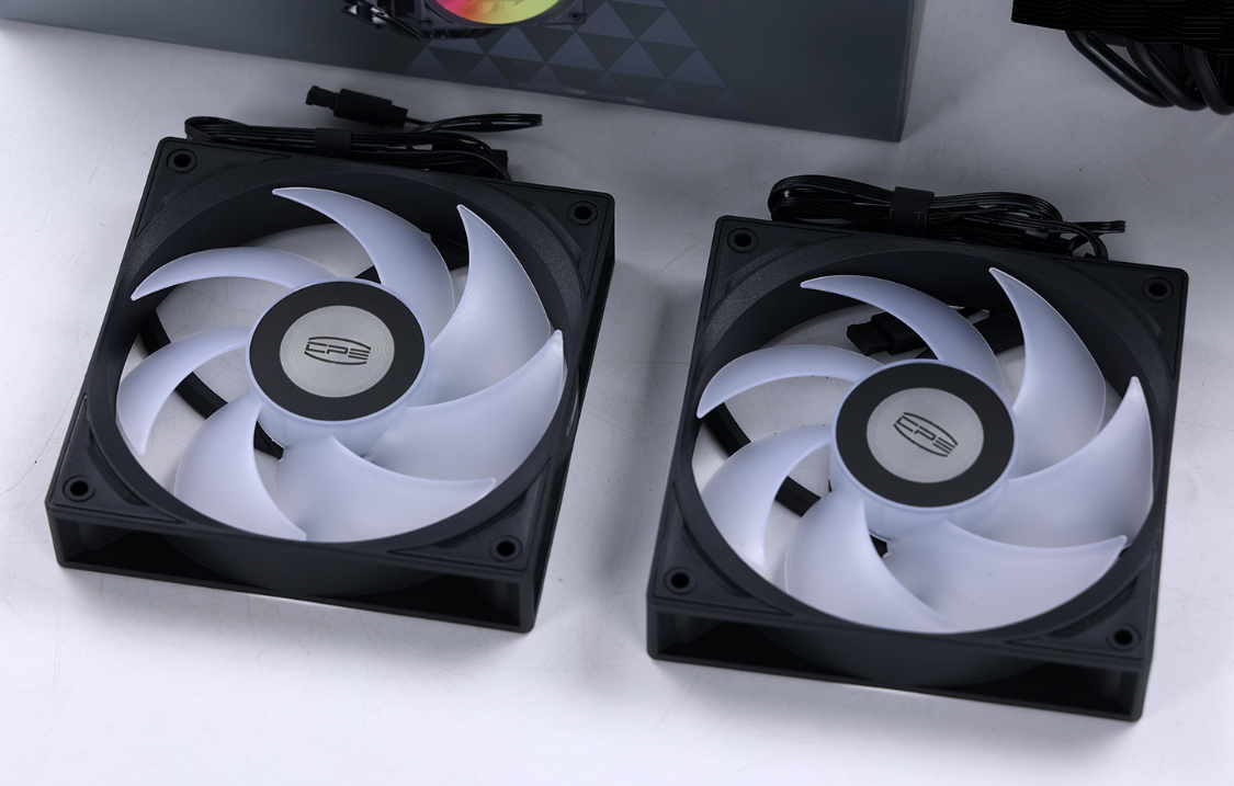 风冷提供两把120mm规格的黑色ARGB风扇。通过PWM 4Pin供电+5v3Pin ARGB灯效同步接口链接至主板。风扇采用高转速马达最高转速可达2200±10%RPM,搭配上7片增压型扇叶,最高可提供73.32CFM风量和3.28mmH2O的风压,而得益于动态液压轴承和风扇四角配备的橡胶减震脚垫,风扇满载运行时的噪音仅为34.9分贝。(其实我应该买无光版本的)