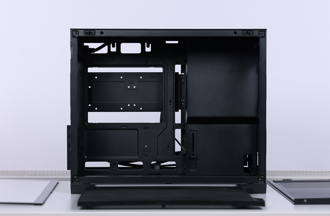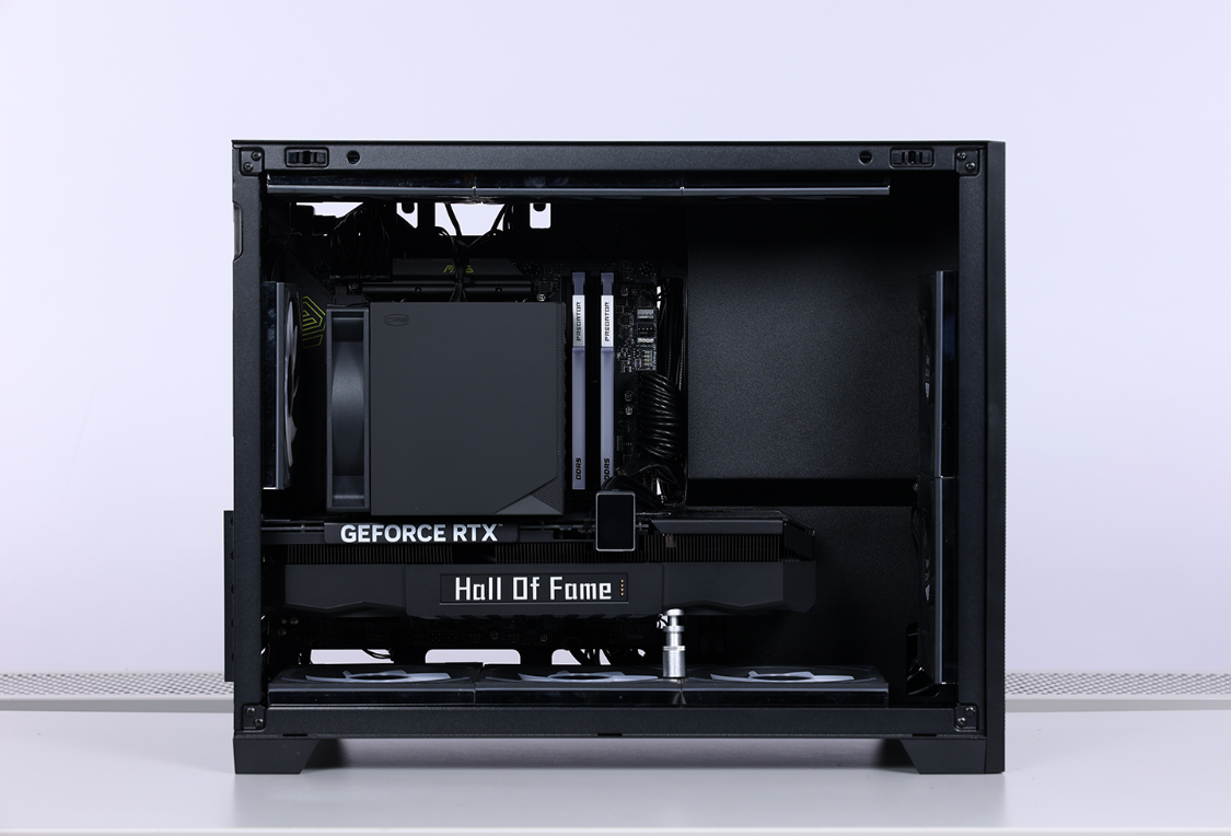 机箱玻璃侧板采用快拆结构,支持MATX/ITX主板,显卡安装限长430mm,支持360水冷,风冷安装限高165mm,最大可安装9把120mm风扇,机箱内还配备了一个可以升降的显卡支架。