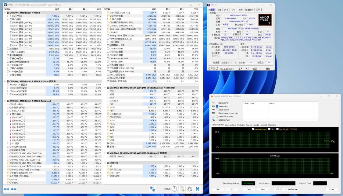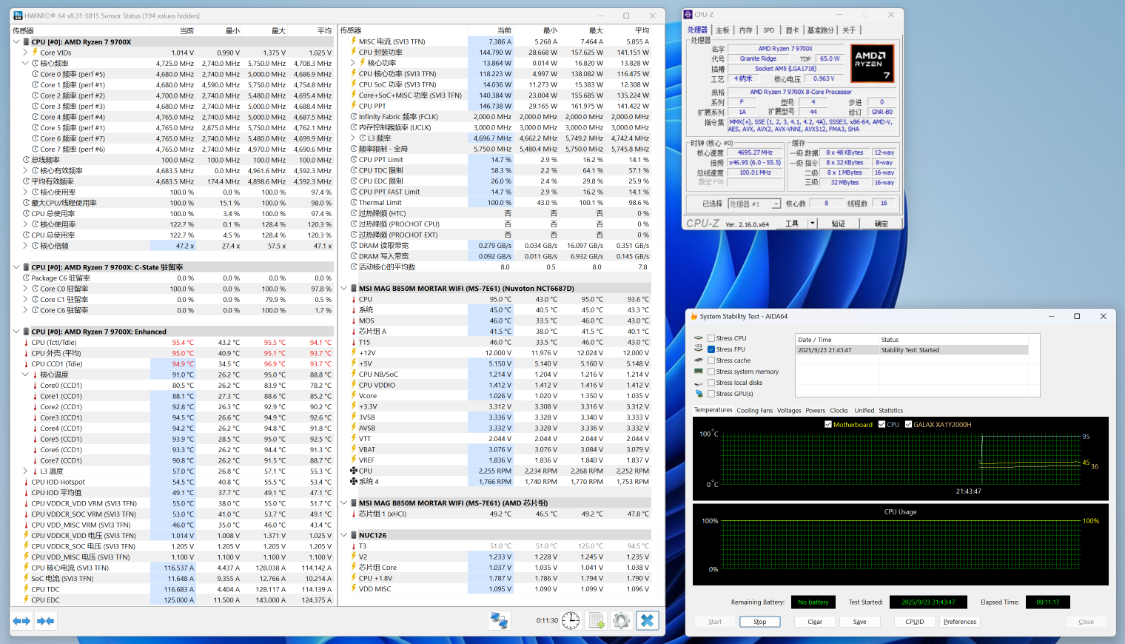 手动调整PBO设置后,CPU实时频率为4.7 GHz左右,CPU外壳温度为95°左右,CPU封装功耗为150W左右;