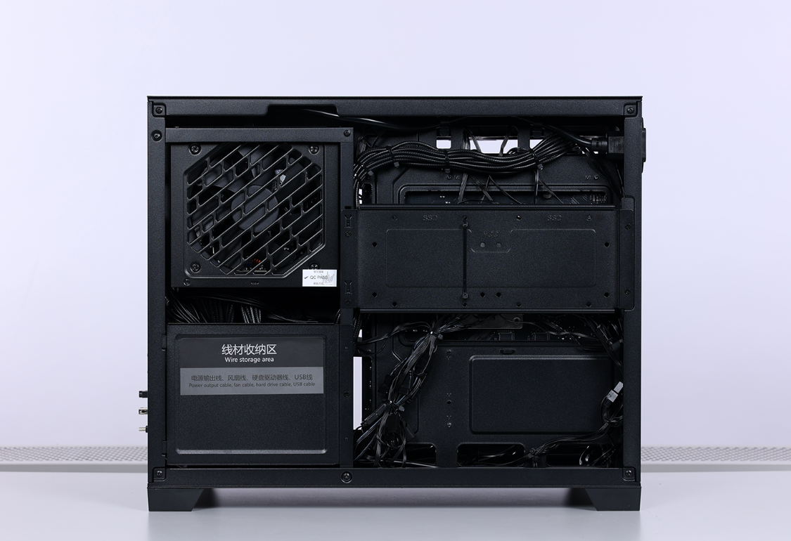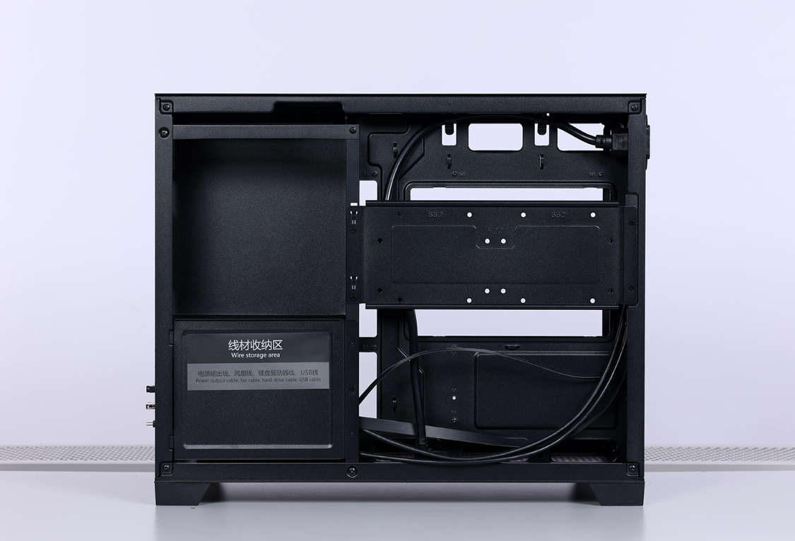 机箱背面提供了一块可拆卸的硬盘支架,可安装2个3.5寸HDD硬盘或2个2.5寸SATA硬盘。机箱采用电源仓顶置设计,需通过机箱尾部预留的电源延长线供电。电源仓下方则预留了一个独立的线材收纳区,收纳区外侧还配备了一块可拆卸的挡线板,相当给力的小细节设计。