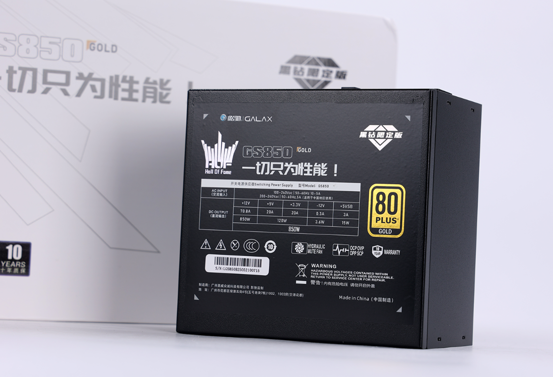 影驰HOF GS-850 黑钻版金牌全模组电源。名人堂不仅打破常规发布了黑色的HOF显卡,电源也紧随其后。电源三围,140*150*86mm,短机身的设计可以更好的兼容各种装机环境,全模组压纹线既显档次又方便走线。80plus金牌认证+全日系电解电容+10年质保+一键风扇启停的超强组合,也能让玩家用得绝对安心。支持最新的ATX 3.1电源规范和PCIE 5.1电源标准,自带12VHPWR模组线最大可提供600W供电。也可以完美兼容最新的RTX 50系显卡的供电支持。