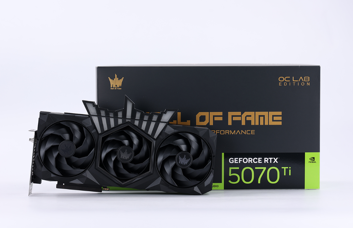 影驰RTX 5070 Ti HOF OC LAB 黑魂X 显卡:颠覆纯白传统,为HOF系列注入了全新的“黑魂”美学。标志性的可拆式磁吸皇冠灯件支持ARGB神光同步,信仰与可玩性都拉满。全黑配色的显卡本体,钻石切割造型散热外壳,质感优秀。3颗黑色无光霜环风扇设计,同时中间风扇边缘及顶部灯带,搭配同样搭载ARGB灯效的皇冠设计,信仰拉满。不过需要竖装才能欣赏到。