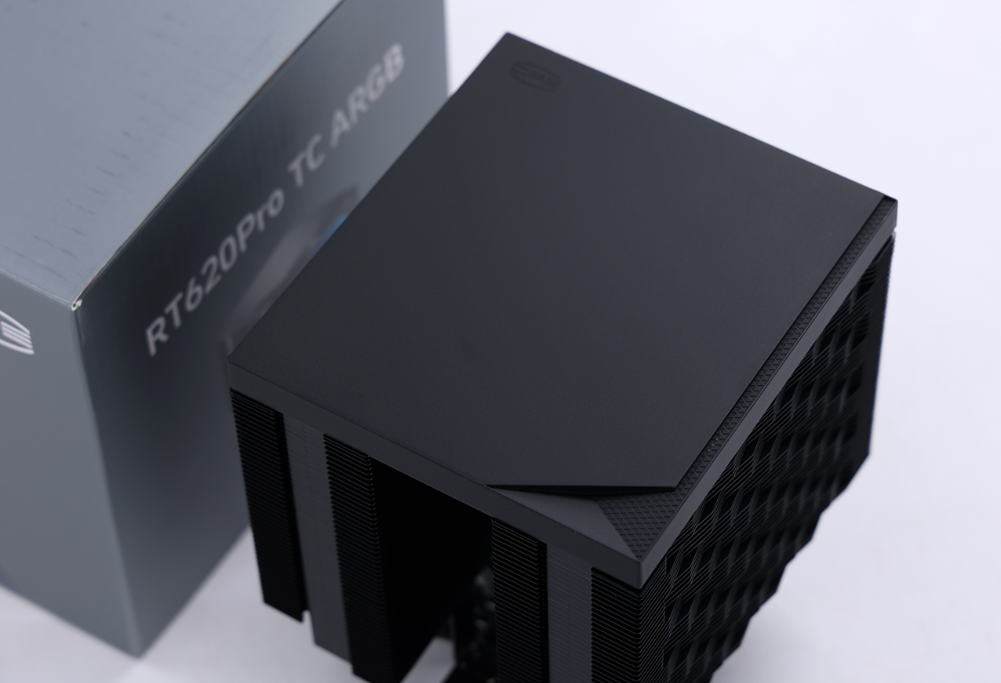 双塔结构的塔体采用全黑配色,塔体顶部配备了一块纯黑哑光配色一体式顶盖,通过卡扣方式固定。塔体共配备6根纯铜热管,热管采用对称的结构布局,并通过穿Fin的工艺与散热塔体链接,而散热塔体则由53片大面积铝合金散热鳍片通过折Fin的方式相连接,鳍片边缘经过了抛光处理,并采用了几何三角交错的波浪式设计,可以在保证散热效能的同时,有效降低散热器的风噪。鳍片和热管表面还喷涂了黑色的漆面进行保护,可以有效降低散热塔体氧化的概率从而提高散热器的使用寿命。