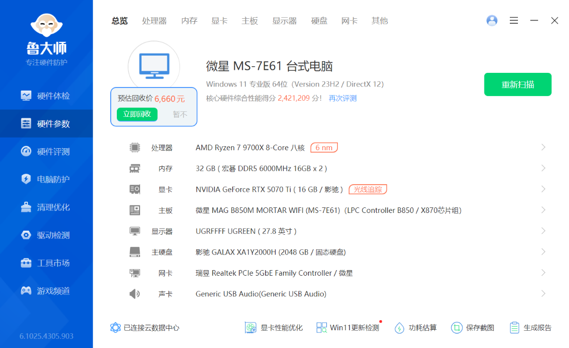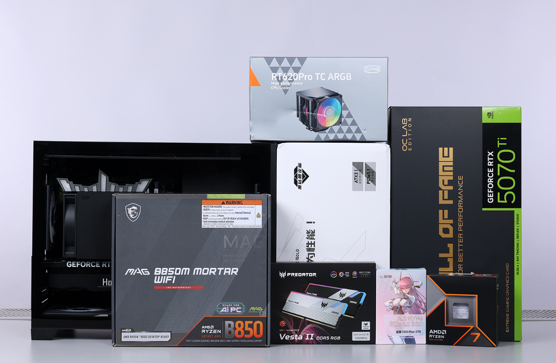 完整配置单∶AMD R7-9700X处理器、微星MAG B850M MORTAR WIFI主板、影驰RTX 5070Ti HOF OC LAB黑魂X显卡、宏碁掠夺者Vesta II 炫光星舰 D5-6000 C2816G*2内存、星曜7000Plus 2T M.2固态硬盘、超频三RT620Pro TC ARGB黑色风冷、HOF GS-850 ATX3.1 黑钻版金牌全模组电源、影驰黑色侧透机箱、影驰梦境二代黑色散热风扇*9...领券全凭个人运气,所以整机预算就不献丑了。
