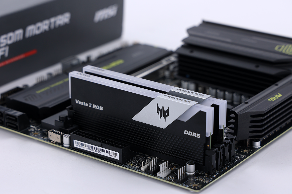 宏碁掠夺者 Vesta II 炫光星舰 D5-600016G*2内存。棱角分明内存造型搭配上加厚加高金属马甲和质地均匀透光材料灯效区域,质感没得说,C28的超低时序,不用费力折腾就能最大程度发挥D5内存的效能。当下的内存行情,除了离谱没啥好说的。
