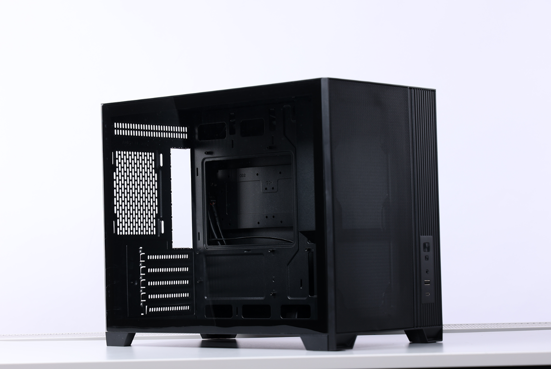 机箱选择的是一款影驰新品MATX侧透机箱,三围450*235*360mm,相对紧凑。机箱前脸采用左侧大面积MESH面板+右侧格栅装饰面板设计,辨识度高。机箱左侧是一块经过暗化处理的钢化玻璃面板,右侧则是带大面积散热开孔的金属侧板。
