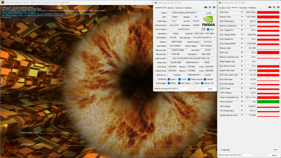 FurMark烤机测试,烤机25 Min后,显卡温度为67°左右,显卡功耗为300W左右;