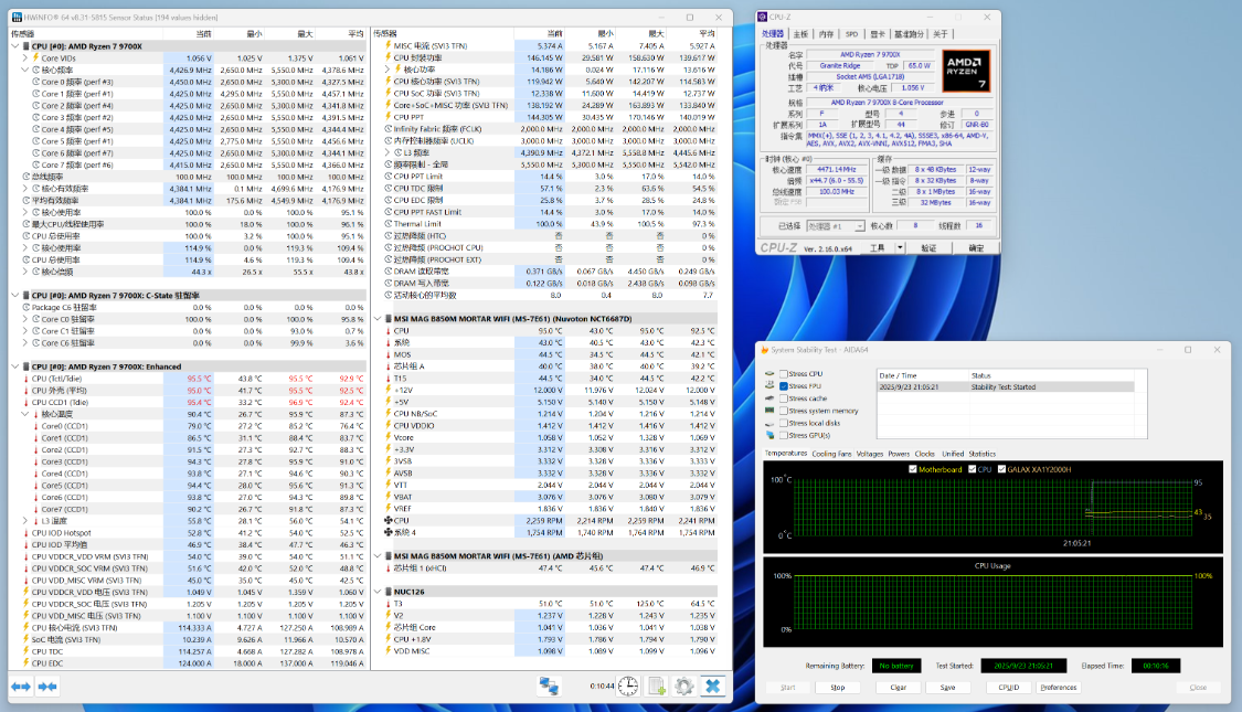 开启PBO Enable设置后,CPU实时频率为4.4 GHz左右,CPU外壳温度为95°左右,CPU封装功耗为150W左右;