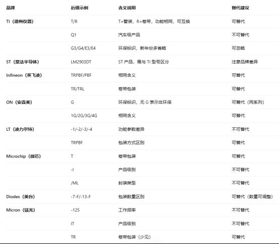 芯片型号通常由“字母 + 数字 + 字母”组成,就像不同包装的可乐(瓶装、罐装、玻璃装),后缀不同代表规格也不同。对采购新手来说,这些后缀就像密码一样神秘。本文整理常见品牌芯片后缀的含义和替代规则,帮你快速入门。