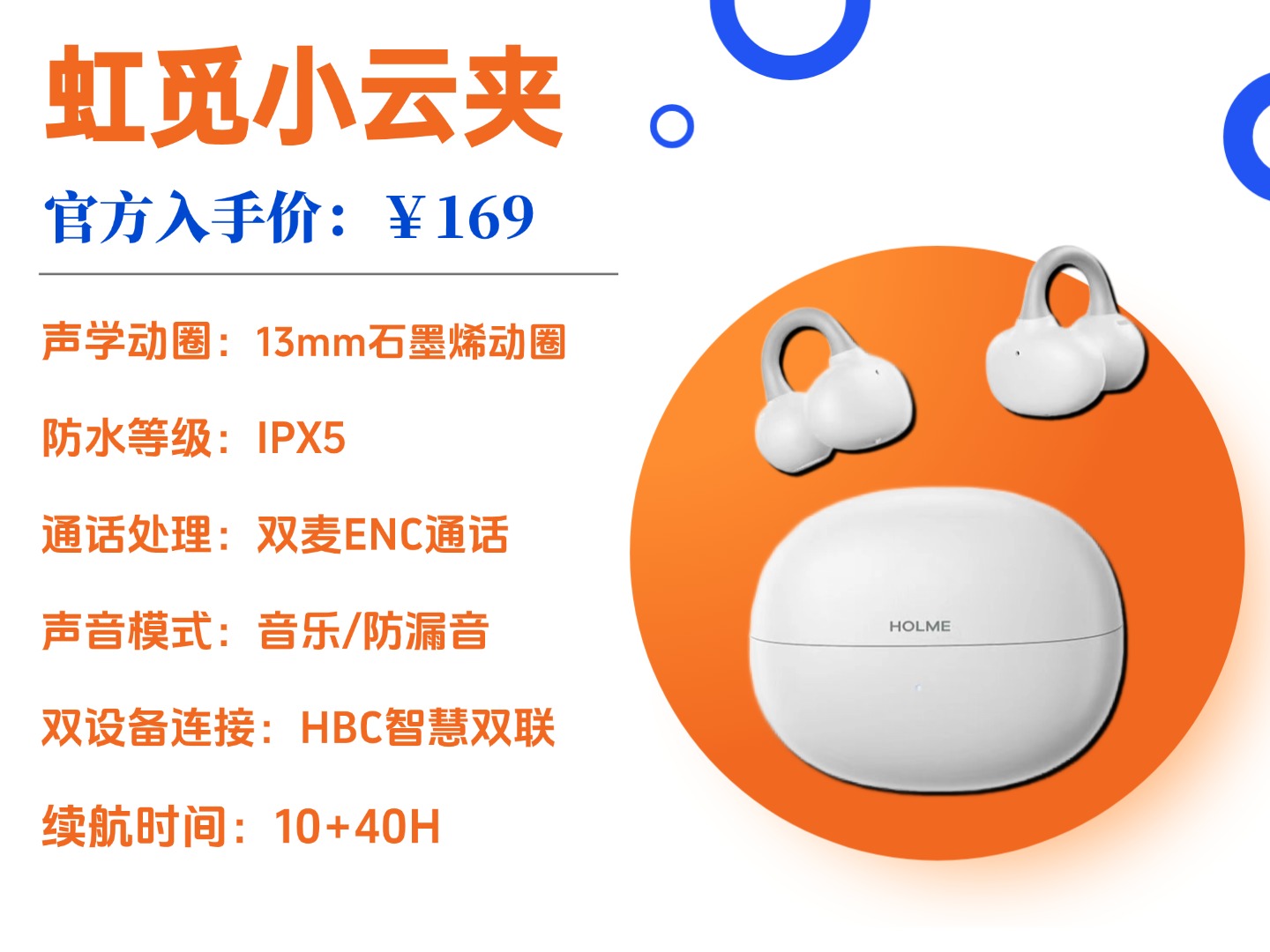 虹觅HOLME Air2小云夹价格:169 元推荐理由:百元价位最具性价比之选,佩戴无感,适合初次尝试耳夹式耳机的新手入门,闭眼入不踩雷。