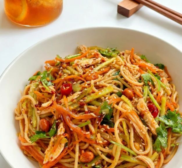 把晾好的面条盛到碗里,铺上鸡丝,再切点黄瓜丝、绿豆芽焯水后也放上去。淋上刚才调好的料汁,撒一把花生碎或者熟芝麻。拌的时候从底下往上翻,让每根面条都裹上红油。吃一口,面条筋道,鸡丝不柴,酸辣里透着甜,麻味在舌头上轻轻跳,黄瓜丝脆生生的,口感一层一层的。