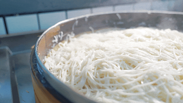 他家的蒸饵丝一直恪守古法,从选米到加料,坚持8步手作。只用曲靖的优质大米,浸制蒸煮直至面糊状,再反复捶打;手工揉制后定型、切丝;拌油后蒸制。店里的大蒸笼火气十足,细细的饵丝蒸1-2分钟就熟了~