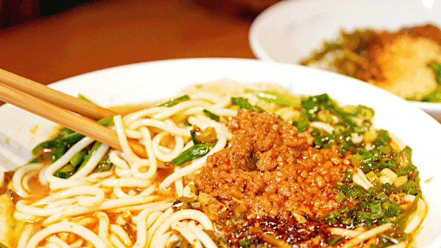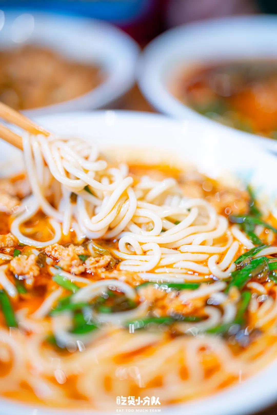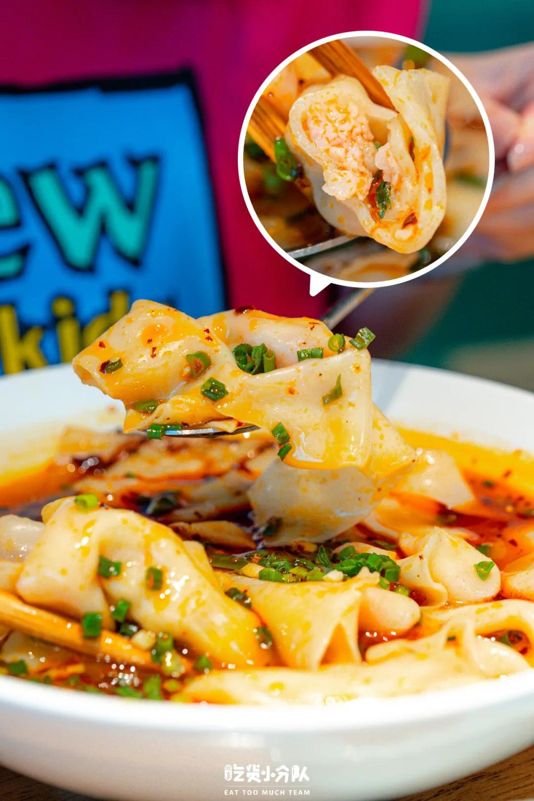 馄饨的形状跟咱们常吃的不同,是个长条形的小包袱。皮还比较柔韧,特别挂香辣的汤汁,里面是鲜肉馅儿的。还有葱花提香,整体吃起来鲜鲜辣辣,还能发点汗,很痛快~