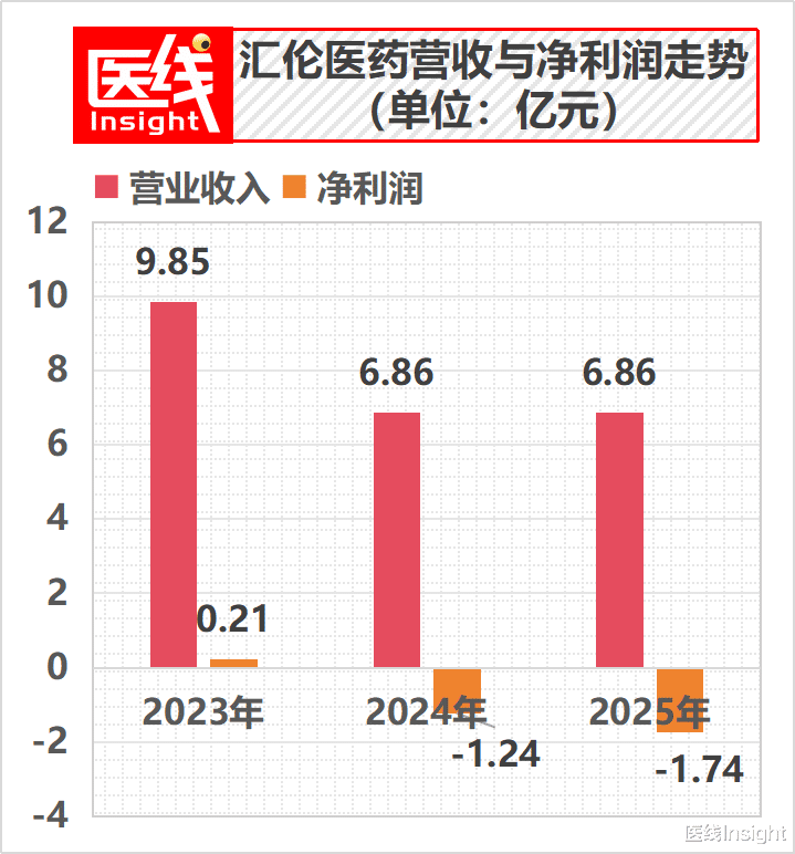 招股书显示,2023年、2024年及2025年,汇伦医药的营业收入分别为9.85亿元、6.86亿元和6.86亿元。