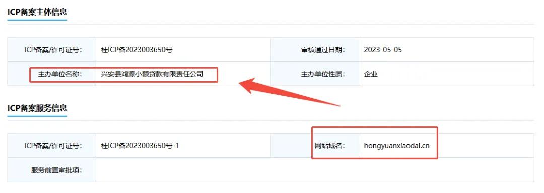 我们进一步点击页面上的隐私协议,协议上的联系邮箱是kefu@hongyuanxiaodai.cn,通过工信部icp备案查询,该域名备案主体正是兴安县鸿源小额贷款有限责任公司。
