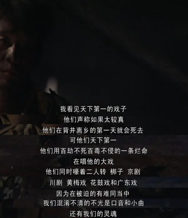 孟烦了在一旁独白:“我看见天下第一的戏子,他们声称如果太较真,他们在背井离乡的第一天就会死去,可他们天下第一,他们用百劫不死百毒不侵的一条烂命在唱他的大戏。他们同时嚎着二人转,梆子,京剧,川剧,黄梅戏,花鼓戏和广东戏,因为在被迫的有难同当中,我们混淆不清的不光是口音和小曲,还有我们的灵魂。”