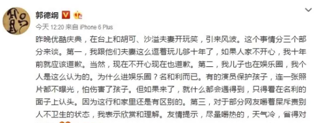 但郭德纲不但不顺着话茬,反而说“说明你们家好客”,虽然郭德纲在相声里讲段子,逗人笑,但很多网友都认为,对着人家孩子说这样的话,是不是有些过了。