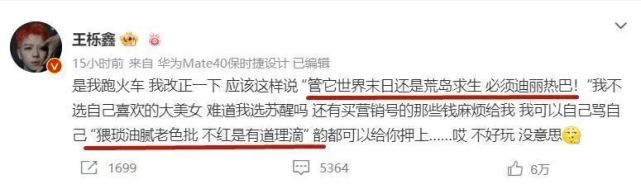 王栎鑫看到事情愈演愈烈后,又在社交平台上发文回应了此事,说“管他是世界末日还是荒岛求生,必须迪丽热巴!我不选自己喜欢的大美女,难道选苏醒吗?”