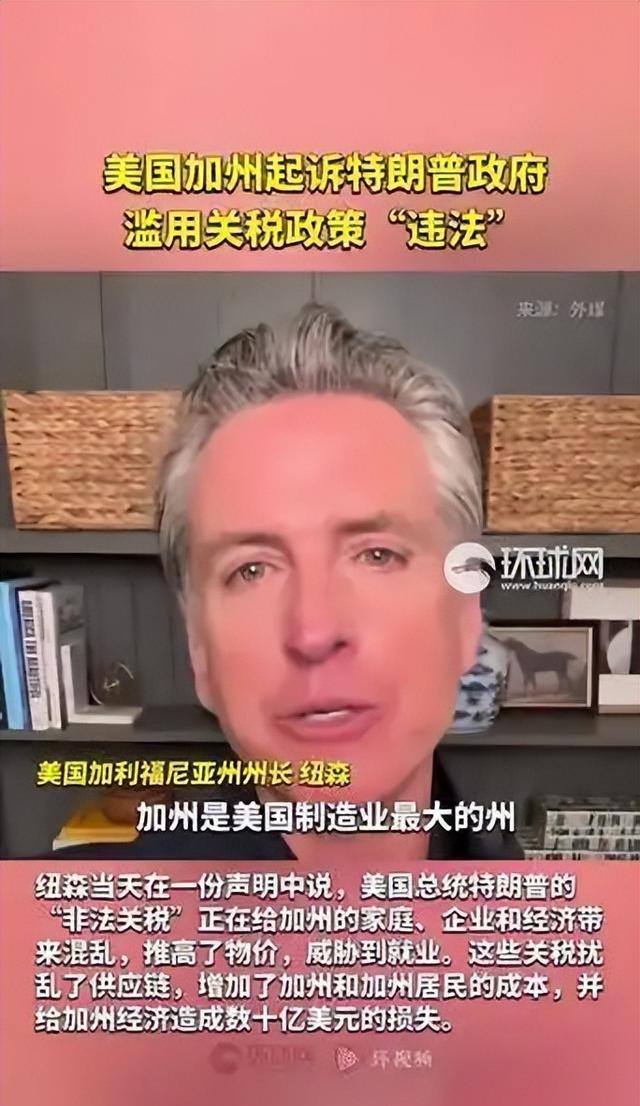 加州州长纽森代表加州政府,因为关税问题起诉了特朗普政府。他指责特朗普政府滥用关税政策,认为这种行为违反法律。