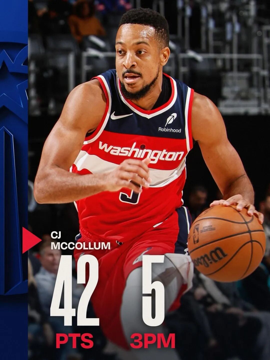 那场比赛,奇才客场加时惜败2分,麦科勒姆全场打了43分钟,投篮25中14,三分10中5,罚球11中9,得到42分6篮板4助攻。