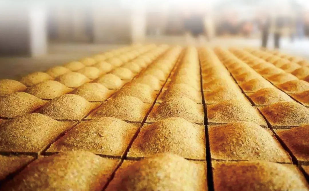 首先,将小麦粉碎,加入水和 “母曲” 拌匀,让每一粒小麦都充分吸收水分和母曲中的微生物,为后续的发酵做好准备。接着,把拌匀后的大曲放入木制模具里,此时,工人们便站在盒子上,用双脚有节奏地踩动,将大曲踩制成特定的形状。